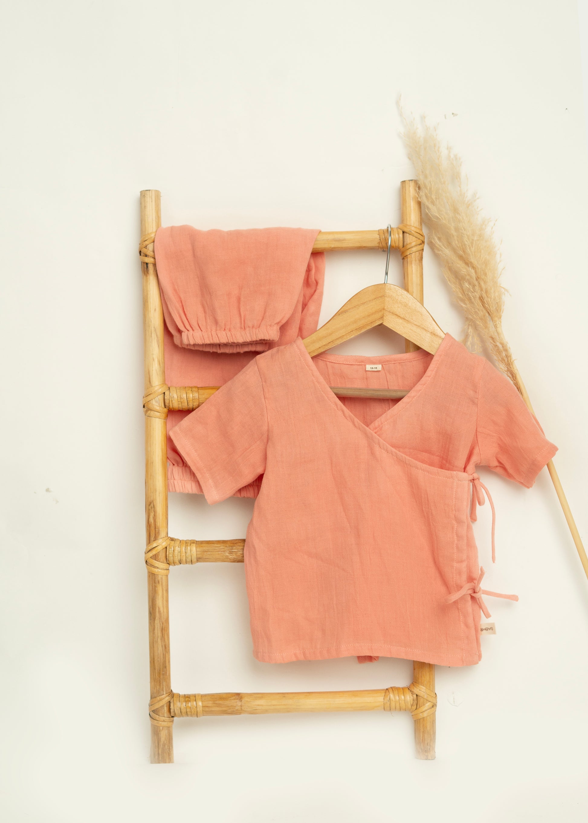 A soft peachy wrap top paired with matching cuffed pants crafted in breathable organic cotton for all-day ease. The tie-up detail and gentle elastic make it perfect for airports, sunny brunches, or slow beach strolls light, comfy, and full of that endless summer feel.